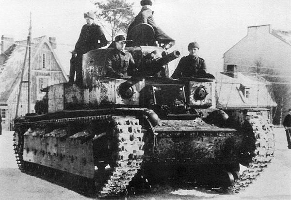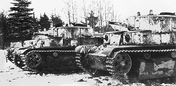 Танкисты 91-го танкового батальона 20-й танковой бригады, получившие звание Герой Советского Союза у своего танка. Слева направо: воентехник 2-го ранга Коваль, командир башни Луппов, радист Симонян. Карельский перешеек, февраль 1940 года. Обратите внимание, что один из траков на гусенице перевёрнут гребнем наружу для улучшения сцепления с грунтом (ЦМВС).