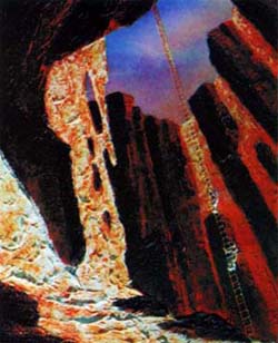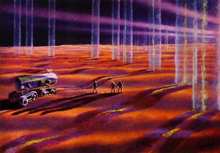 Тем не менее на эти картины можно посмотреть совсем по-другому: представим, что на них изображены растения созданные человеком специально для оживления Марса. На Марсе уже создана атмосфера, пусть еше и очень разряженная и огромные, легкие и прочные стебли-крылья улавливают свет слабого Солнца, вырабатывая кислород для второго дома космического Красной Империи - будущего Звездного Человечества.