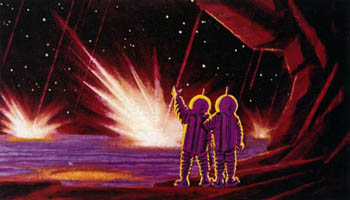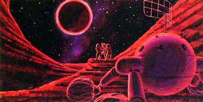 На Луне наступило солнечное затмение. Резко потемнело и похолодало. В это время на Земле затмение Луны. Диск нашей планеты, вчетверо больше на Луне, чем Солнце. Вокруг Земли виден очень яркий ободок атмосферы.