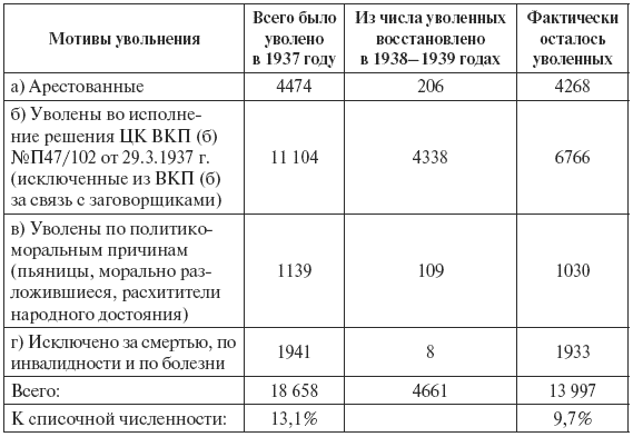 В 1937 году уволено 18 658 человек (13,1 %). Из них политсостава 2 194 человека.