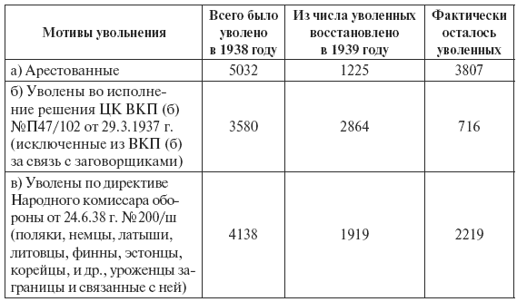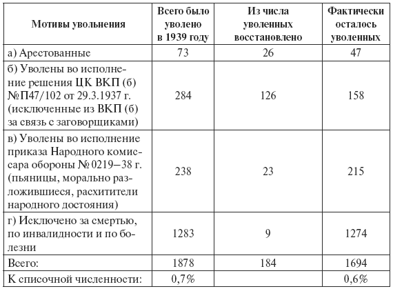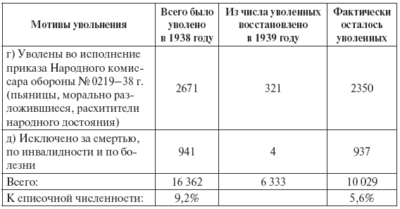 2. За 1938-39 годы 11 723 человека или 2,3 % к списочной численности (в том числе 3 515 человек политсостава), т. е. почти в три раза меньше против 1936-37 годов.