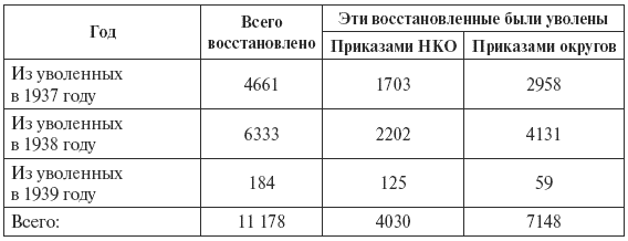 В общем числе уволенных, как за 1936–1937 годы, так и за 1938–1939 годы было большое количество арестовано и уволено несправедливо. Поэтому много поступало жалоб в Наркомат обороны, в ЦК ВКП(б) и на имя т. Сталина. Мною в августе 1938 года была создана специальная комиссия для разбора жалоб уволенных командиров, которая тщательно проверяла материалы уволенных путем личного вызова их, выезда на места работников Управления, запросов парторганизаций, отдельных коммунистов и командиров, знающих уволенных, через органы НКВД и т. д.