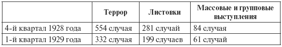 В первом квартале 1929 года произошло снижение по всем основным видам антисоветской деятельности в деревне – террору, листовкам и массовым выступлениям. Это отражено в таблице.