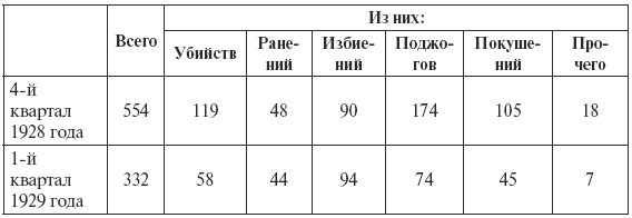 В очередной раз мы вынуждены констатировать, что снижения количества случаев кулацкого террора – затишье перед бурей. В июне 1929 года было зарегистрировано 304 эпизода (для сравнения – в мае 228), из них убийств – 30, ранений – 17, покушений – 39, поджогов – 138 и сто избиений. [61] Опасная тенденция сохранилась и летом 1929 года. В октябре чекисты были вынуждены признать, что за период с июля по сентябрь 1929 года: