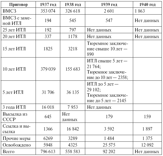 Статистика о вынесенных судебными органами приговорах в 1937–1940 годах [368] .