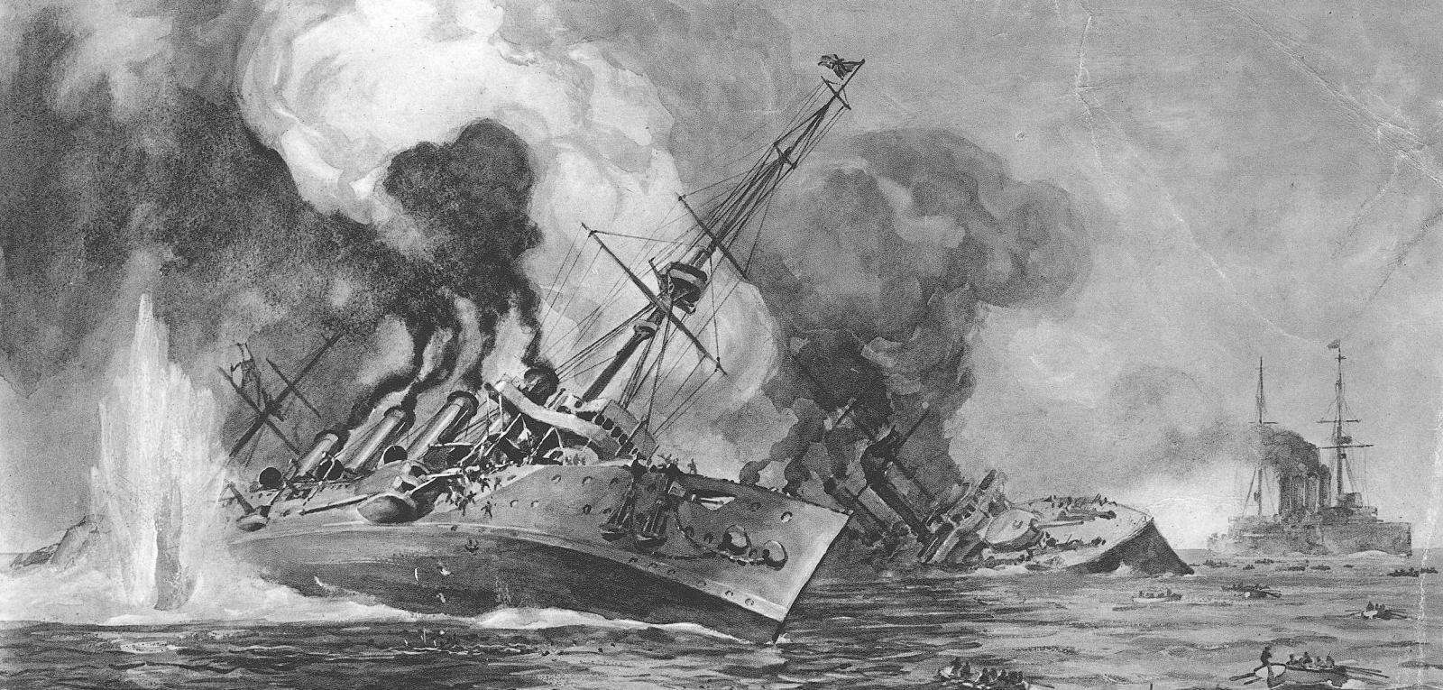 За секунду до того, как тринадцати-с-половиной-дюймовые орудия дали залп, в “Трафальгар” попало сразу два снаряда. Корабль накренился и четыре гигантских столба встали в полукабельтове от несчастного островка.