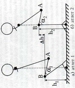 а) как видно из рис.6 (а), высота колена атлета (а) – h1 меньше чем у атлета (б) – h2 (h1 < h2). Казалось бы, какая разница? Но вспомним правило: «точка вращения тазобедренного сустава А должна быть ниже точки вращения коленного сустава В». Значит чем выше колено В, тем выше может быть точка А. Значит спортсмен может приседать на h' выше, не нарушая при этом правила соревнований! Значит возможно уменьшение амплитуды движения на величину dh (дельта h)!