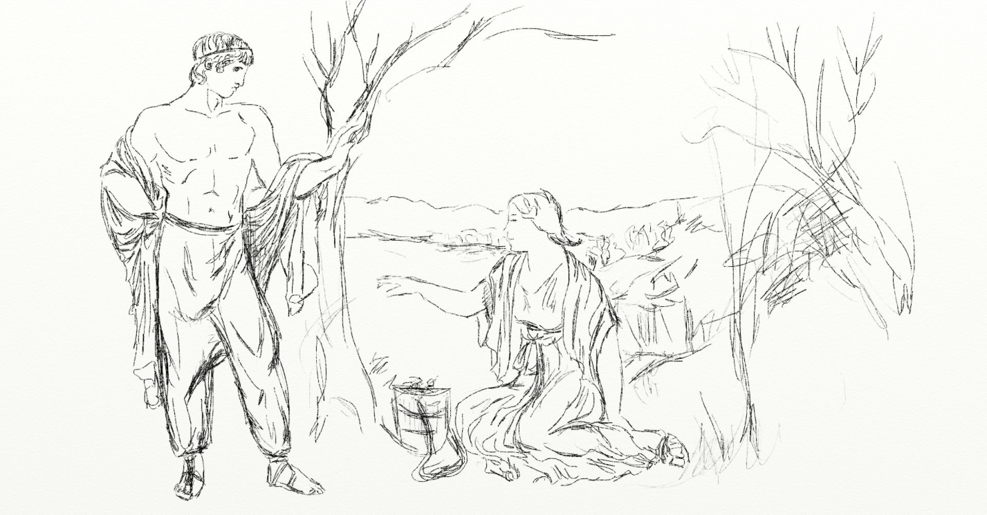 Завидев обратившего на неё внимание юношу, она призывно замахала рукой. Гиматий, прикрывавший голову, сполз на плечи, и из-под него вырвалась наружу тугая светлая косичка.