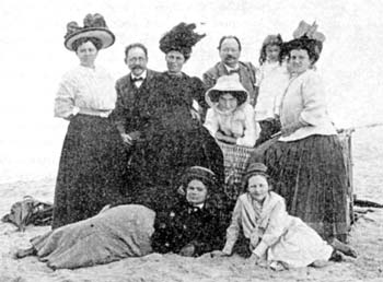 Лили с семьей на курорте. Мужчина слева — ее отец Юрий Александрович Каган, рядом с ним (справа) Елена Юльевна, Лили склонилась над плетеным креслом. Эльза сидит на песке в светлом платье.