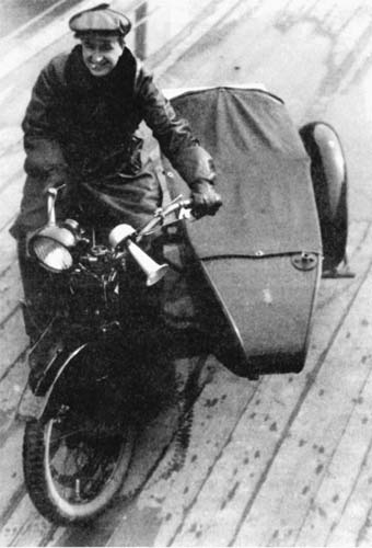 Лев Кулешов на своем мотоцикле, в люльке которого с удовольствием катались и Лили и Маяковский. Фото сделано в типичном для Александра Родченко ракурсе, 1927 г.