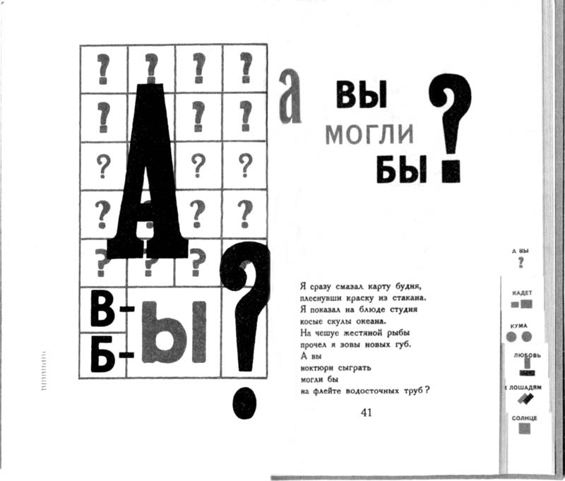 Следующий разворот. В книге «Два голоса» Эль Лисицкий хотел передать смысл и ритм стихов Маяковского графическими и типографскими средствами. Она оформлена как телефонная книжка, где буквы заменены графическими знаками и названиями стихов.