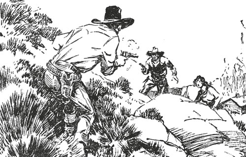 Однако эту черту нужно было ещё преодолеть. Извилистая улочка сделала ещё один зигзаг, и впереди показался самый крайний дом поселения. Рядом с этим домом стоял седобородый человек, шериф графства Сан-Леон Андерс. Местные жители величали его «Папашей». Узловатая стариковская ладонь сжимала рукоять старомодного кольта, что выглядывал из кобуры у его бедра. Левая рука была поднята кверху – тщетная попытка заставить беглецов остановиться.