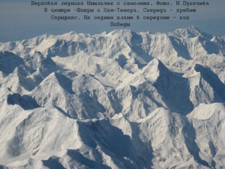 трудным и более опасным, чем Центральный Памир. Здесь добавляются суровость более высокой северной широты, капризы погоды, влияние водной глади Иссык-Куля, сухих пыльных ветров с пустыни Такла-Макан и многое-многое другое… Статистика весьма красноречива: из пяти семитысячников СССР (включая Хан-Тенгри) на долю пика Победа и Хан-Тенгри приходится лишь 5,5 % восхождений (по данным 1974 года)…Попасть в этот район было моей мечтой еще с ранней юности. Сюда, где возвышались легендарные вершины пика Победы – самого северного и сурового семитысячника и прекрасная белоснежная вершина Хан-Тенгри изо льда, снега и бело-розового мрамора, переливающаяся красными красками в лучах заката. Вершины таинственные, с перепутанными позже названиями, известные как «Повелитель неба», «Гора крови»… Здесь в огромных ущельях лежали колоссальные ледники Иныльчек и Каинды, а на слиянии Северного рукава Иныльчека с общим руслом голубело загадочное некогда озеро Мерцбахера, обычно исчезающее во время осеннего паводка… Район складчато– глыбовых гор, несколько иных по строению, чем Кавказ и Памир. Зона ледника Иныльчек с примыкающими хребтами является наиболее высоким глыбовым поднятием Центрального Тянь-Шаня. Она выше расположенного восточнее Джунгарского Ала-Тау, выше и мощнее заледенелых громад массивов Куйлю и Ак-Шийрака западнее. Не говоря уже о Западном и Северном Тянь-Шане.