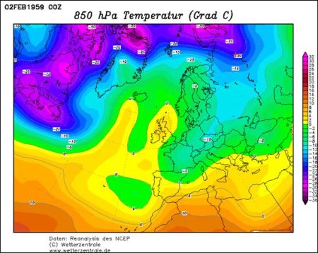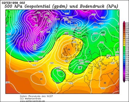 Группа пошла вниз. Вот здесь вступил в действие новый фактор аварии, о котором группа Дятлова не знала. Температура вечером и в ночь аварии упала на минус 23,9 градуса до минус 28,8 в Бурмантово (-28,3 – в Няксимволе, – 28,7 – в Печоре). Усилился ветер, поднявшего свежий снег в виде поземки и низовой метели (также могли иметь место и небольшие осадки ввиду близости графиков температур и точек росы). По всем признакам имело место явление типа «бора», – падение холодного воздуха с горного хребта вниз с усилением ветра (вообще «бора» обычно наблюдаются в прибрежных районах гор, но здесь имело место сходное по типу явление при перевале холодного воздуха горного хребта). Карта температур с видимым вторжением холодного фронта в ночь аварии (на 5.00 по Свердловскому времени) приведена ниже.
