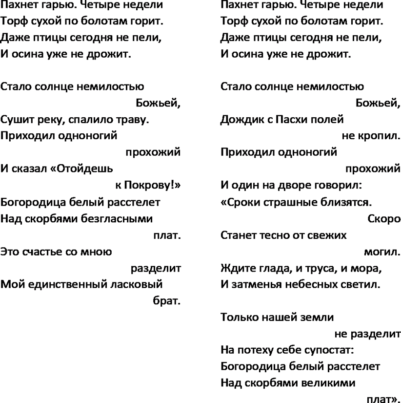 русской поэзии – слепневского стихотворения Ахматовой «Пахнет гарью. Четыре недели…», за которое Д.П. Святополк-Мирский назвал ее новой Кассандрой [142] . Сравним его первую редакцию, под которой в рукописи проставлено довоенное 11-е число, с той, которая в сентябрьском номере «Аполлона» датирована 20 июля – днем, когда Чуковский, Анненков, Евреинов и Репин, узнав об объявленной накануне войне, вслух читали в Куоккале «Пир во время чумы» [143] :140