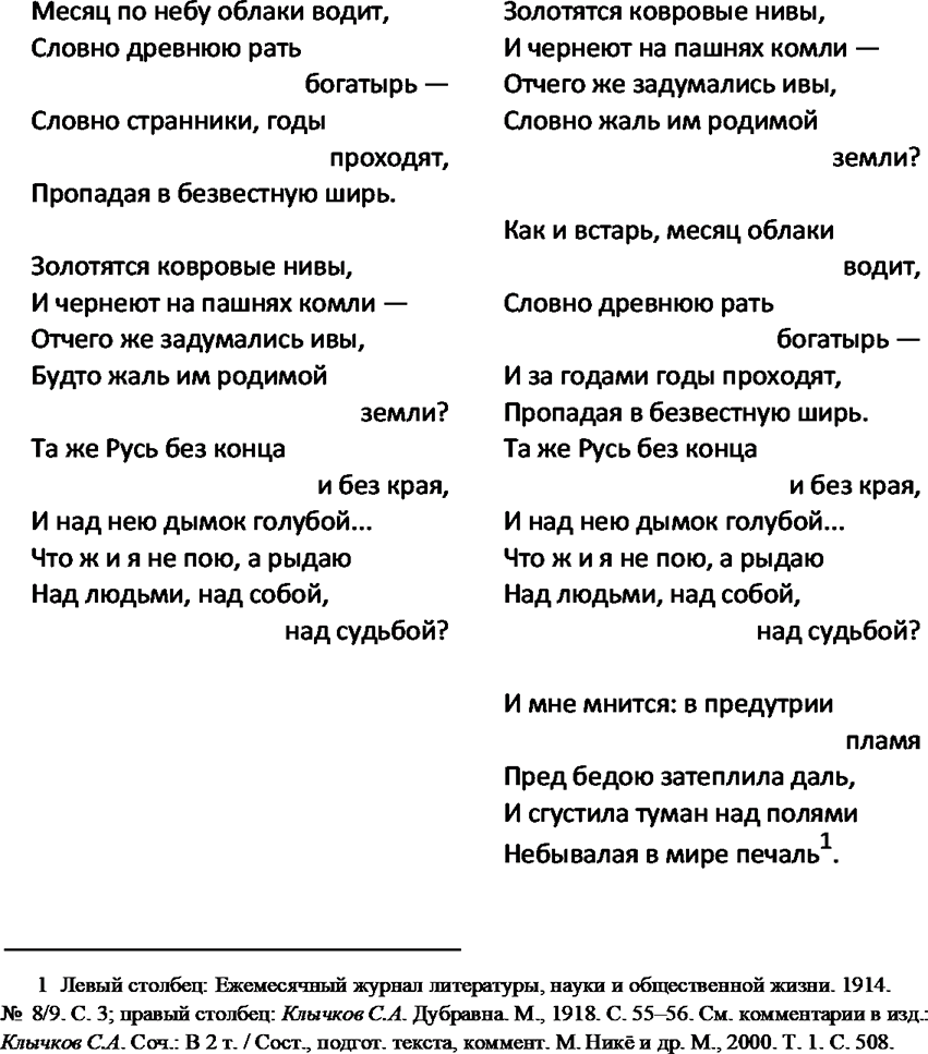 Градус тревоги и интонация финального примирения с неизбежным сохранены, но если в первоначальной версии предсказание калики касается участи и «скорбей» лирической героини, то в версии окончательной плат Богородицы, потеряв связь с праздником Покрова, простерт уже над катастрофой целой страны [144] . Схожую метаморфозу претерпело между журнальной и первой книжной публикациями пейзажное стихотворение С.А. Клычкова, заодно получив и характерное заглавие («Предчувствие»):
