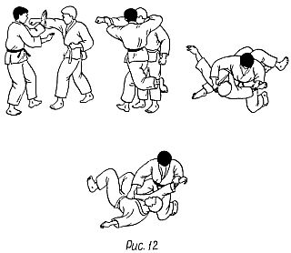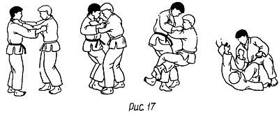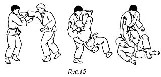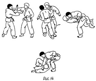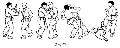 в) Приставив левую ногу к правой, подбейте противника тазом и усилием туловища и рук проведите бросок влево-вниз, после чего нанесите удар ногой в промежность.