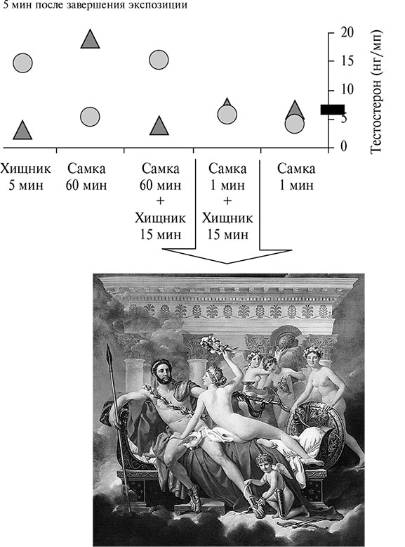 у мужчин настороженность. Если, собираясь на занятия по выездке, девушка говорит: «Пока нет принца, поезжу сама на белом коне», то это провоцирует мужчин на ответные шутки о ее затянувшемся девичестве, что болезненно для всякой женщины. Но, главное, что к ней начинают относиться не как к женщине, а как к хорошему товарищу, к «боевой подруге». И шансы на замужество все тают.Рис. 8.71. Самоидентификация человека как женщины либо как мужчины удовлетворяет социальную потребность разделять общество на «своих» и «чужих». «Мы» всегда лучше, чем «они». На картине Зигмара Польке мужчина поверженным гадом корчится под каблуками трех девушек; кроме того, он сжимает в руке бескрылую птицу – очевидный символ никчемности
