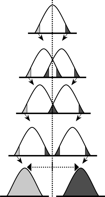 Кривая представляет собой распределение признака в исходной популяции. Животные, у которых он выражен максимально и минимально, дают следующее поколение. В нем тоже для воспроизводства отбираются животные с экстремальными значениями признака. Та же процедура повторяется в каждом последующем поколении. Через несколько поколений различие между средними значениями двух популяций животных будет больше, чем различие между крайними значениями внутри каждой группы. При селекции крыс по высокой и низкой скорости избегания, т. е. по поведению типа А и типа Б, такое различие между группами может быть получено в пятом поколении.