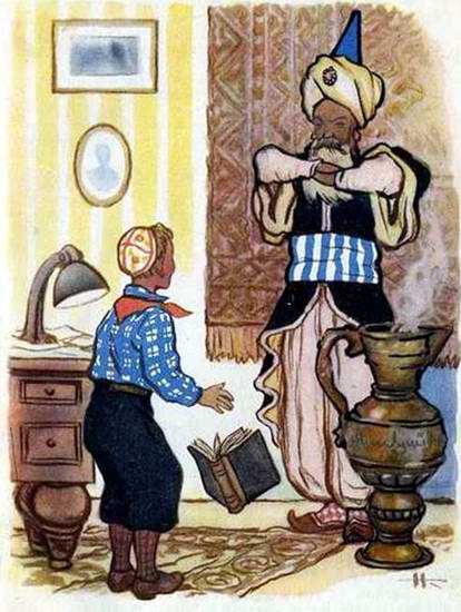 И вот тут-то и совершилось чудо: медный кувшин зазвенел, окутался дымом, и около стола появился седобородый старик в чалме и пестром халате.