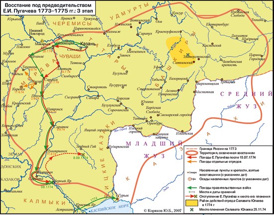 В какой-то момент войско Пугачева заняло большую часть Урала и Поволжья. Пугачев с сообщниками для пущей важности называл деревню Каргалу (Сеитовский посад) Петербургом, Сакмарский городок (ныне – Сакмарск) – Киевом, а излюбленную им резиденцию Берды под Оренбургом – Москвой. Восстание под предводительством Е. П. Пугачева 1773–1775 гг. 3 этап. Карта. © Юрий Коряков