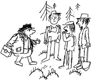 господин Ау уже сидел на сосне. Сидел и слушал.Вот послышался шум трактора, и на поляну выехали бурильщики. С ними был румяный, шарикообразный мужчина. Он всеми командовал.