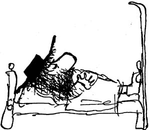 Он сел на край постели и почувствовал, как сон охватил его. Тогда дядюшка закинул ногу вверх, поставил лыжу на пятку и задремал. Он был похож на человека в больнице, у которого нога на растяжке.
