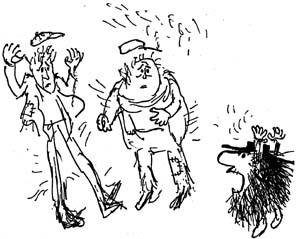 Что сталось с навозными мордами! Ужас отразился на их… как бы это сказать… навозных лицах, и они бросились от господина Ау, как лучшие финские спортсмены. На поле битвы осталась бабушкина сумка и несколько зубов для амулета, принадлежащего господину Ау, а также большущая нераспечатанная бутылка лечебного красного вина,