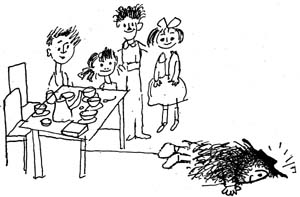 А дети тискали его, обнимали, и он совсем застеснялся. Он встал, кивком поблагодарил всех и направился к дверям. Веревка, привязанная к ножке стола, натянулась. Дети приготовили улыбки… Трах! Полетел на пол дядюшка Ау, стол и посуда со стола…