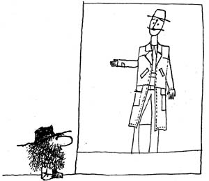 "Надо все-все запомнить, – решил дядюшка. – Когда я еще попаду в город! А вдруг у меня будут внуки, что я им расскажу про город? А запомнить все лучше при помощи рифмы. Вот запомни, например, слово "телега"? Ни за что. А если скажешь: "Шла телега, везла три тонны снега". Это у тебя сразу уложится в голове. Или слово "заяц". Быстрое слово, сразу из головы выскакивает. А стихотворение застревает надолго. "Гулял по лесу заяц, отъявленный мерзавец!" Это уже кое-что. На сто лет запоминается. Во я даю! – восхитился собой опасный и резкий господин Ау. – Это уже почти открытие. Все, что хочешь запомнить, надо рифмовать. Первым до этого додумался народ. Все его пословицы в рифму".
