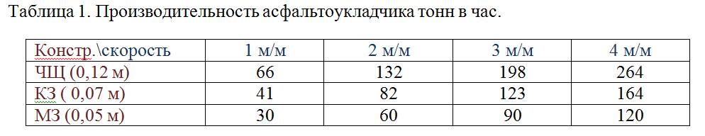 Теперь для того что бы понимать сколько нам нужно Асфальтоукладчиков мы должны знать производительность одного асфальтоукладчика, которая во многом зависит от толщины и ширины укладки, мы принимаем ширину укладки 4 метра, получаем следующее :