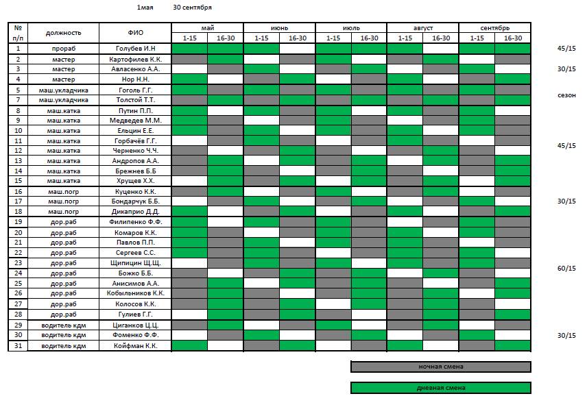 Следующим шагом нужно укомплектовать комплекс людьми и составить график работы людей. Состав механизаторов комплектуется совместно с механиком , состав ИТР и дорожных рабочих комплектуется совместно с начальником участка. В данном случае составление графика отличается от обычного графика вахтового метода, так как большинство рабочих работают сезонно либо же по графику 45/15, 30/15 и т.д. После составления графика смотрим сколько рабочих есть в наличии и сколько еще требуется принять человек на работу. Ну и соответственно формируем заявку на соответствующие вакансии.