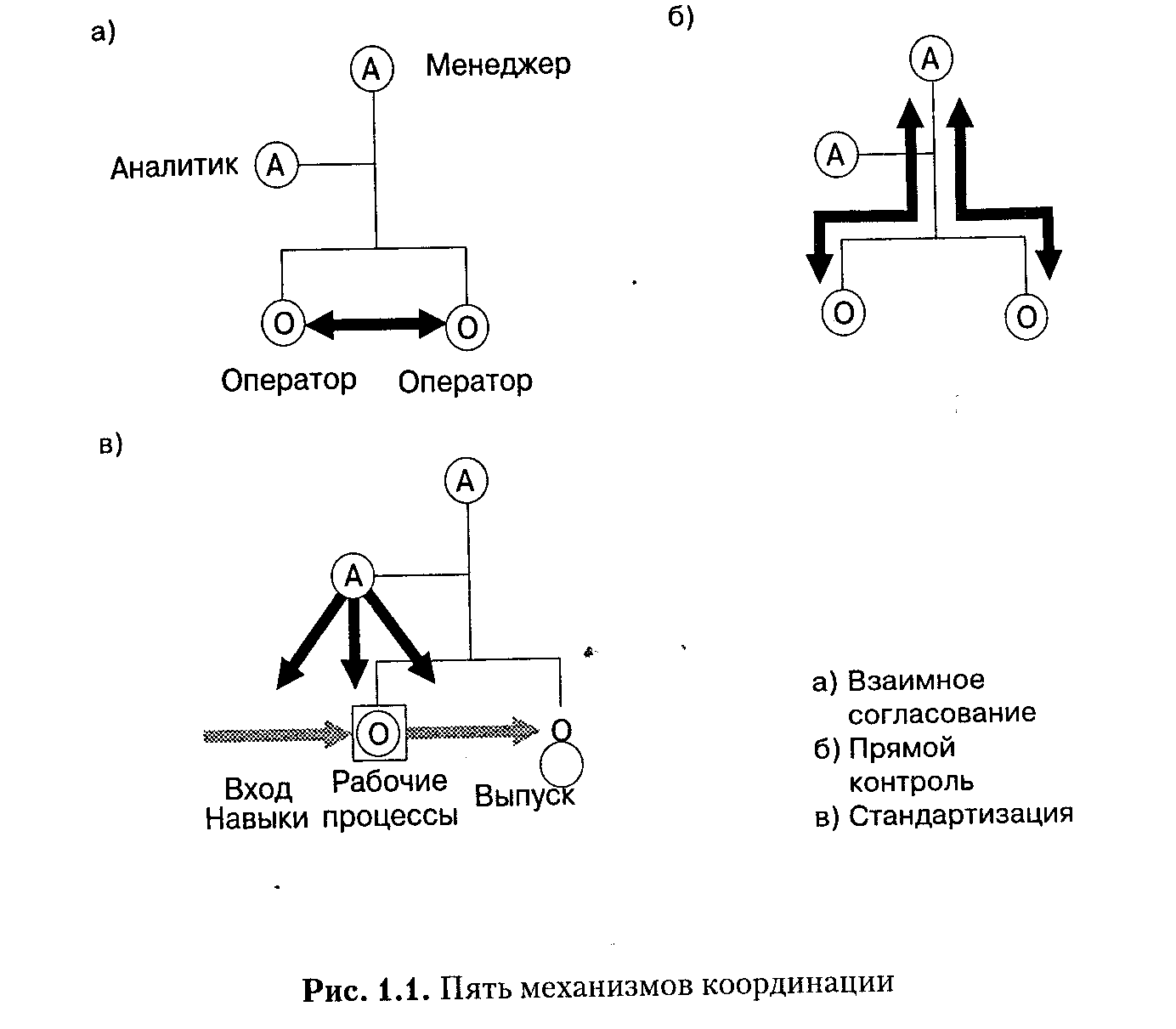 Пять координационных механизмов в основном раскрывают способы, посредством которых организации координируют свою деятельность: взаимное согласование, прямой контроль, стандартизация рабочих процессов, стандартизация выпуска и стандартизация навыков и знаний (квалификации). Рассмотрим вкратце каждый из них.