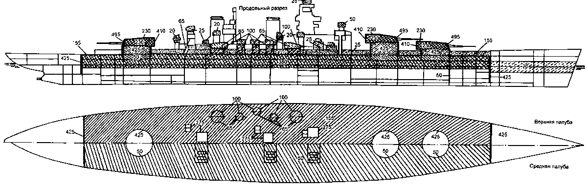 ПМЗ принималась американского типа с сохранением ее взрывосопротивляемости по проекту 23 и переходом от булей с цилиндрическими обводами к булям «ящико-образным» типа принятых на новых американских линкорах, что позволяло реализовав защиту с мало изменяющейся по вертикали глубиной.