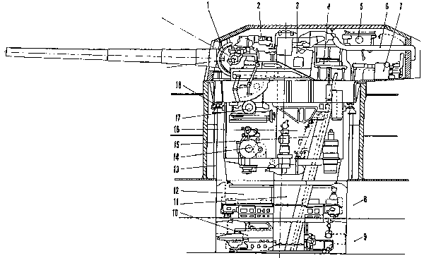I — качающийся щит; 2 — башенный прицел; 3 — казенник; 4 — лоток подачи; 5 — 10,5-м дальномер; 6 — вентиляционная труба; 7 — досыла-тель; 8 — зарядный погреб; 9 — снарядный погреб; 10 — перегрузочное отделение снарядов; 11 — главная труба подъемника; 12 — перегрузочное отделение зарядов; 13—жесткий барабан; 14 — гидравлическая система; 15 — вспомогательный подъемник; 16 — машинное отделение; 17 — механизм вертикальной наводки; 18 — шаровой погон.