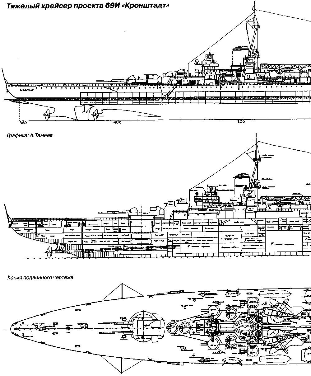 — об установке этих башен на тяжелых крейсерах «Кронштадт» и «Севастополь», заложенных по проекту 69 на заводах № 194 в Ленинграде и № 200 в Николаеве и дальнейшей постройке этих кораблей с германскими 380-мм башнями и германскими ПУС главного калибра по новому техническому проекту;