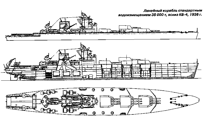 Что касается тяжелого крейсера с 305-мм артиллерией ГК, то в проекте ЦКБС-1 (апрель 1936 года) его стандартное водоизмещение составило 29 000 т. (вооружение — девять 305-мм, 12 152-мм, 16 100-мм, 32 37-мм орудия, главный броневой пояс 250 мм, палубы 30—125 мм, общая мощность четырех-вальной ГЭУ 200 000 л. с, скорость хода 33 уз, дальность плавания 7000 миль экономическим ходом), а в проекте КБ-4 — 26 000 т. (вооружение — девять 305-мм, 16 130-мм, 12 37-мм, главный броневой пояс 250 мм, палубы 30—125 мм, общая мощность четырех-вальной ГЭУ 240 000 л. с). Фактически это были быстроходные линкоры, аналогичные французскому «Дюнкерку» и германскому «Шарнхорсту». Тем не менее, УМС продолжало числить эти корабли в крейсерах, видимо, считая невозможным выступать с концепцией одновременного создания линкоров трех типов (водоизмещением 55 000 т., 35 000 т. и 26 000 т.).