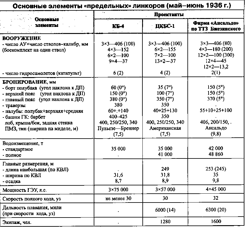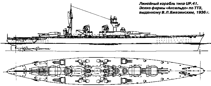году. Строить эти корабли предполагалось в Ленинграде и Николаеве. Начинать их проектирование приходилось в условиях практической утраты дореволюционного опыта создания крупных кораблей. Недостаток опыта предполагалось восполнить, как это уже имело место с легкими крейсерами и эсминцами, заимствованием материалов за рубежом. Соответствующие предложения от итальянской фирмы «Ансальдо» были получены еще в марте 1936 года, и для решения вопросов на месте в Италию была направлена группа специалистов во главе с начальником ЦКБС-1 В.Л. Бжезинским.Группе удалось приобрести достаточно ценные для нас по тому времени материалы по 29,5-узловому линкору стандартным водоизмещением 28 000 т (с девятью 343-мм орудиями ГК) и большим крейсерам водоизмещением 22 000 и 19 000 т (с 254-мм артиллерией ГК). Кроме того, по заданию В.Л. Бжезинского фирма «Ансальдо» разработала проект линкора стандартным водоизмещением 42 000 т с девятью 406-мм орудиями ГК, броневым поясом 370 мм и скоростью хода 30 уз. Была достигнута также договоренность (потребовавшая заключения специального межправительственного соглашения) о возможности применения на советских кораблях системы подводной защиты, аналогичной используемой на кораблях итальянского флота (то есть системы Пульезе). Все эти материалы послужили ориентиром для назначения величины водоизмещения линкоров «А» и «Б» при разработке ТТЗ на их проектирование, а также использовались при дальнейших работах по проектированию этих кораблей.