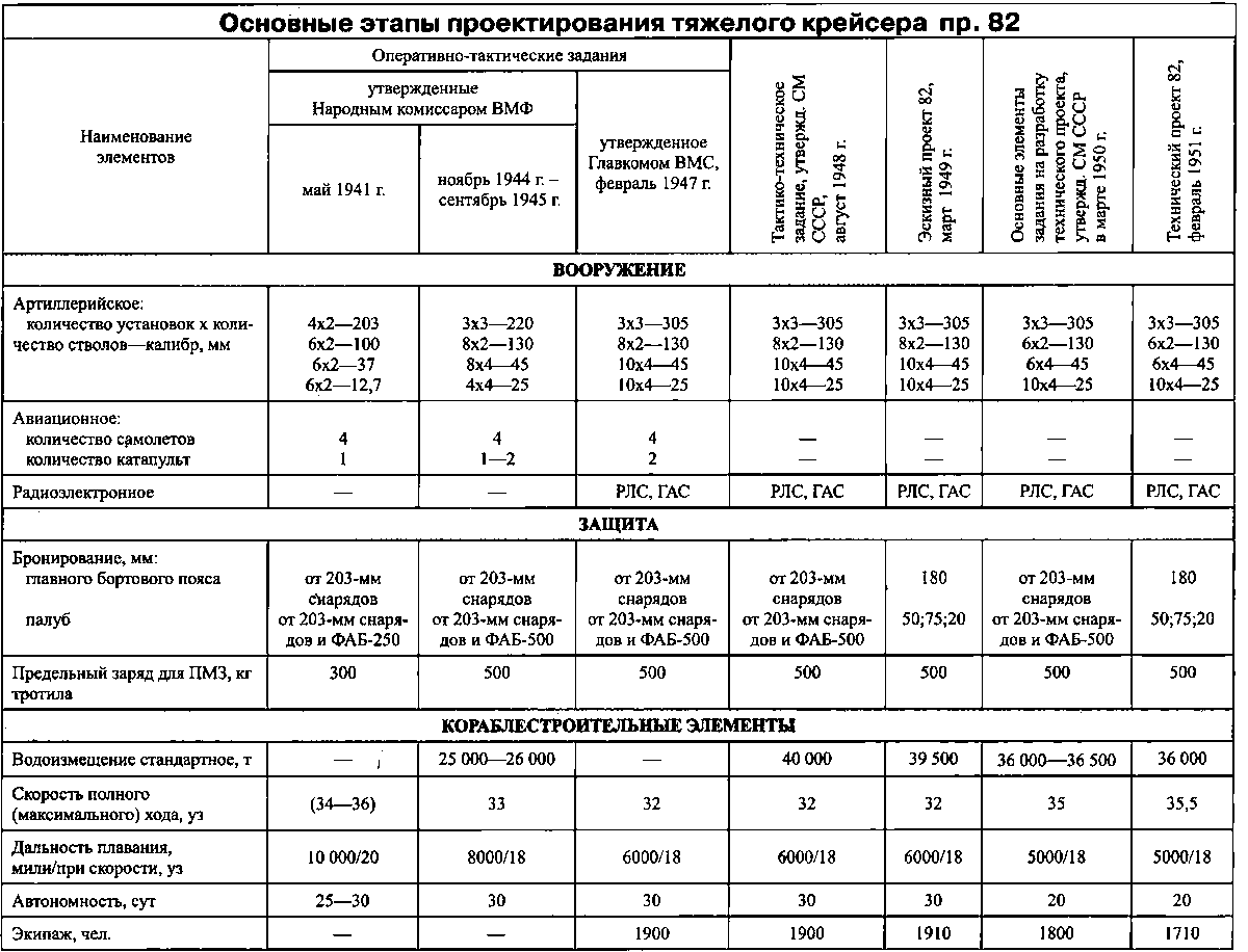 С учетом изложенных выше замечаний И.В. Сталина по эскизному проекту и результатов разработки предварительного этапа техпроекта, представленных вновь образованным Военно-морским министерством (ВММ) и МСП, Совет Министров СССР постановлением от 25 марта 1950 г. утвердил основные элементы задания на разработку технического проекта 82 с частичными изменениями ТТЗ, утвержденного в августе 1948 года. Они касались увеличения скорости полного хода до 35 уз (за счет уменьшения состава артиллерии УК и МЗА, количества боезапаса всех калибров, сокращения водоизмещения до 36 000—36 500 т, дальности плавания и автономности) и разрешил МСП без корректировки эскизного проекта приступить к техническому, с представлением его на утверждение правительства в феврале 1951 года. Одновременно МСП обязали начать во втором квартале того же года строительство двух кораблей проекта 82 на заводах № 444 (бывший № 198) в Николаеве и № 189 в Ленинграде со сдачей их ВМС в 1954 и 1955 годах соответственно. Решение ВММ и МСП по предварительным материалам технического проекта 82, связанным с выбором главных размерений и общего расположения корабля, было утверждено в сентябре 1950 года.