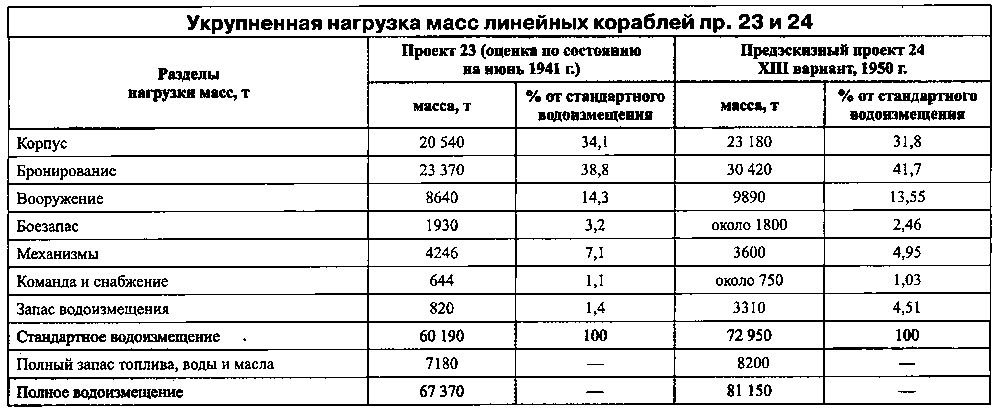 Сравнивая полученные в предэскизном проекте 24 основные элементы корабля с таковыми у линкора «Айова», можно констатировать, что наш перспективный линкор при близком составе вооружения, но меньшем боекомплекте, приходящемся на один ствол, заметно превосходил американский по мощи своей конструктивной защиты как надводной, так и подводной. Это обусловило его существенно большее (в 1,4 раза) водоизмещение, увеличенную мощность ГЭУ (в 1,3 раза), но несколько меньшую скорость