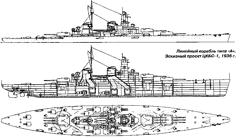 В октябре 1936 года эскизные проекты обоих линкоров были завершены. При одинаковых вооружении и скоростях полного хода разработанные КБ-4 и ЦКБС-1 проекты линкора «А» несколько отличались друг от друга по водоизмещению, главным размерениям, бронированию, а также по обшей компоновке и внешнему виду. Оба бюро превысили оговоренное в ТТЗ стандартное водоизмещение 41 500 т., но, стремясь минимизировать это превышение, несколько отступили от требований ТТЗ по бронированию (прежде всего была уменьшена толщина второго пояса). В проекте КБ-4 была снижена до 420 мм и толщина барбетов башен ГК, причем они принимались не цилиндрическими, а в виде усеченных конусов.