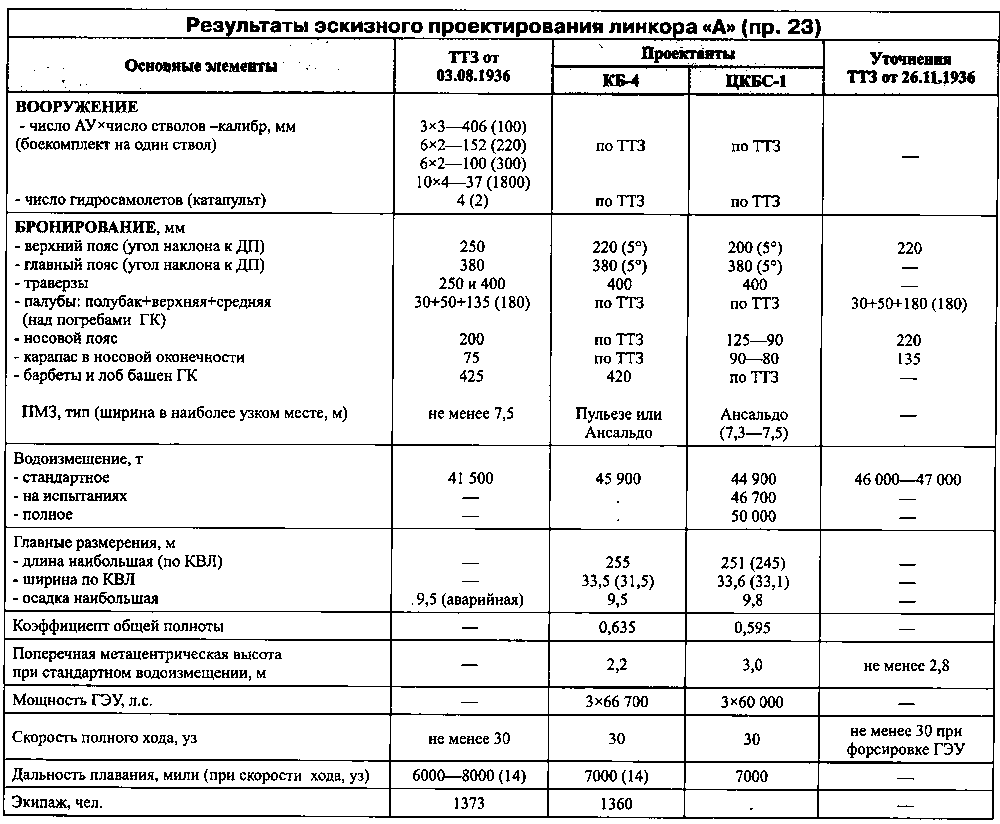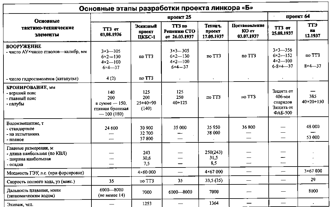 В представленном ЦКБ-17 на рассмотрение в середине мая техпроекте 25 (руководители разработки В.А. Никитин и В.П. Римский-Корсаков) стандартное водоизмещение линкора «Б» было получено 35 950 т, а скорость полного хода — 33,5 уз при номинальной мощности ГЭУ 268 000 л.с. и 35 уз при ее форсировании до 300 000 л.с.