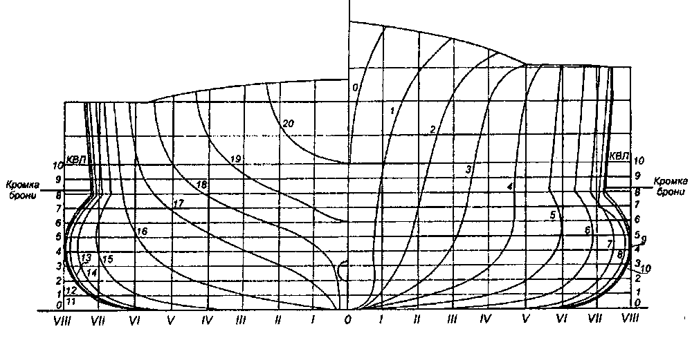 Проекция «корпус» теоретического чертежа линкора проекта 23