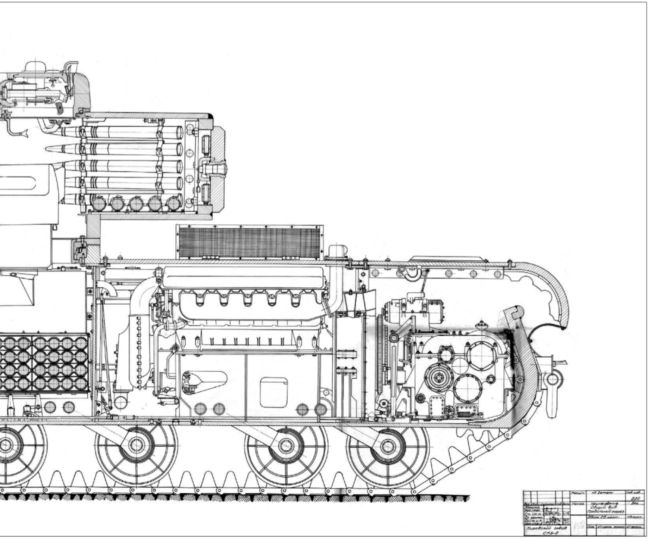 Продольный разрез танка КВ-220, копия заводского чертежа. Вверху фрагментом дана установка курсового пулемета ДТ в лобовом листе корпуса. На чертеже стоит дата — 6 января 1941 года (АСКМ).