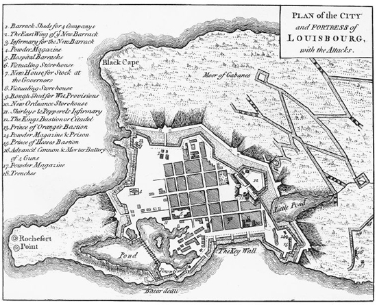 Осада Луисбурга в 1758 году, как никакая другая осада во время войны в Америке, дала возможность действовать в строгом соответствии с этими правилами. Более шести недель город стойко сопротивлялся осаждающим, чьи методы в точности соответствовали предписаниям, изложенным Вобаном в его сочинении «Об атаке и обороне укрепленных мест». Сразу же после высадки 8 июня британцы начали рыть первые параллельные траншеи. К двенадцатому числу Вулф оттеснил последних защитников в город с дальних укреплений и батарей, расположенных вокруг гавани. На девятнадцатое число первые британские пушки открыли огонь с предельной дистанции по городским бастионам и кораблям в гавани. Копание параллелей и сапов продолжалось без устали, пока 3 июля батареи не были возведены в шестистах ярдах от городской стены. К шестому числу британские снаряды — минометные и зажигательные бомбы — стали падать у стен города. В растущем отчаянии и без особого эффекта французы пытались совершать ночные вылазки против вражеских батарей. День за днем продолжался обстрел, ночь за ночью продолжались подкопы. 21 июля раскаленное пушечное ядро попало в один из французских линейных кораблей, стоявших на якоре в гавани, и взорвало порох в его трюме. Судно и два его ближайших соседа сгорели дотла[344].