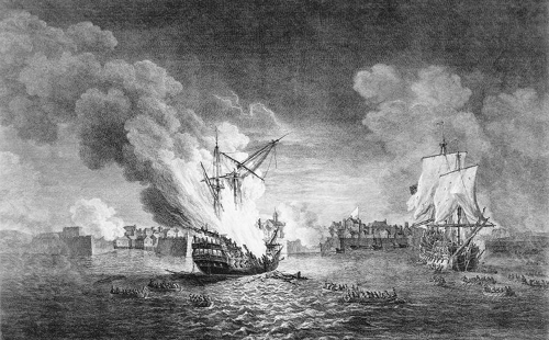 Захват «Бьенфайзанта». Адмирал Боскауэн приказал двум отрядам моряков войти в гавань на шлюпках в ночь на 25 июля, чтобы захватить два единственных уцелевших французских военных корабля. На этой великолепной гравюре 1771 года «Благоразумный», севший на мель слева, был подожжен; тем временем «Бьенфайзант», на котором уже реет «Юнион Джек», буксируют за пределы досягаемости пушек, а батареи в гавани открывают безрезультатный огонь. Любезно предоставлено библиотекой Уильяма Л. Клементса в Мичиганском университете.