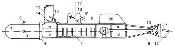 Итальянская управляемая торпеда SLC. 1. Боевая часть. 2. Взрыватель. 3. Серьга. 4. Крепление БЧ. 5. Носовая дифферентная цистерна. 6. Кормовая дифферентная цистерна. 7. Аккумуляторная батарея. 8. Электродвигатель. 9. Гребной вал. 10. Бинт. 11. Руль поворота. 12. Руль глубины. 13. Щиток рулевого управления. 14. Приборная доска. 15. Штурвал. 16. Цистерна быстрого погружения. 17. Воздушная труба. 18. Ручка цистерны быстрого погружения. 19. Ручка места механика. 2(1. Ящик для инструментов и запасных частей. I место рулевого, II место механика.