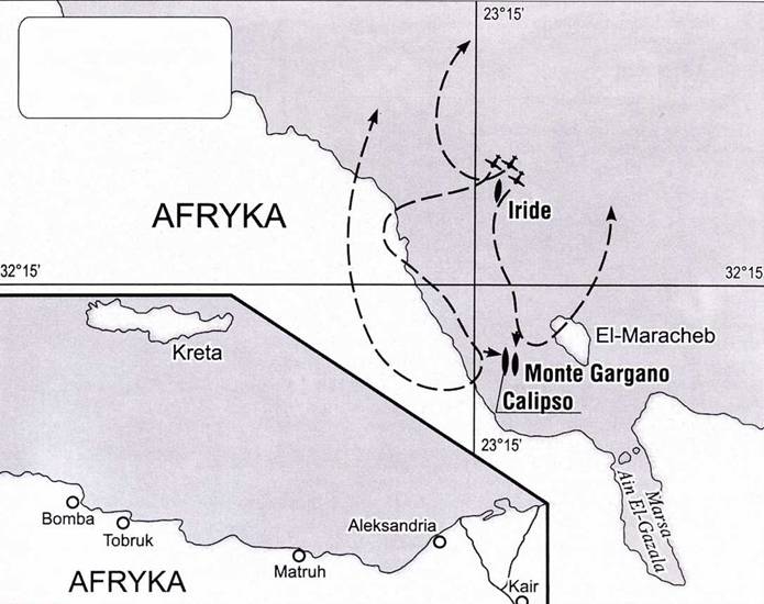 22 августа Calipso добрался до залива Бомба у ливийского побережья. Там его поджидало пассажирское судно Monte Gargano (1931 г., 1976 т.), мобилизованное и превращенное в штабной корабль итальянских морских сил в Ливии. На борту судна находился контр-адмирал Бруно Бривонеси. Кроме того, в заливе находилась подводная лодка Iride под командованием капитан-лейтенанта Франческо Брунетти. Лодка приняла на борт управляемые торпеды и членов их экипажей. Целью атак торпед была Александрия.
