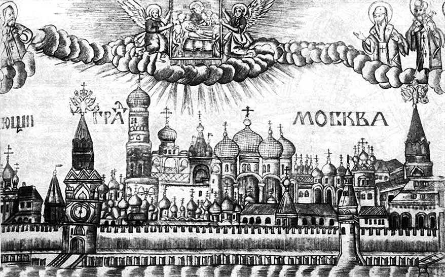 Вид Кремля с реки Москвы. Лубочная гравюра XVII века