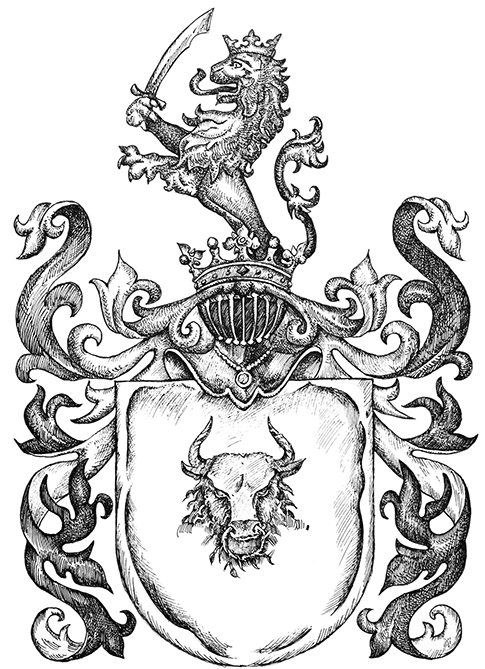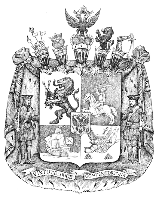 Между прочим, в дипломе говорилось: «Герб твой родовой частью благосклонно подтвердили, частью умножили и вновь прибавили…» Если к чему «прибавили» мы не знаем, то новый герб, который «тебе и потомству твоему употреблять позволяем и повелеваем», описан детально: «щит четверочастный, с которого первое поле верхнее серебряное представляет вставшего льва, совсем красного, выставившего язык, и хвост вверх поднявшего, держащего в правой лапе две мерные трости, на крест положенные, по концам позолоченные, в знак пожалованного тебе генеральского достоинства; второе поле верхнее синее содержит герб Великого княжества Литовского, премененными красками изображенный в знак, что оная провинция есть отчизна твоя; правое нижнее поле являет корабль золотой оснащенный и плавающий, в знак морского твоего достоинства при самодержавном царе московском; четвертое, или левое нижнее поле, показывает военные победоносные знаки, в память, что оный царь тебя, многими войнами и победами прославившегося, учинил полномочным начальником своим; щит средний золотой раздвоенный, разделивший надвое герб, Священныя Римския империи и Королевства Польского, с находящимися между голов обоих орлов короною московскою, со вложенным в грудной щит коронованным сердцем, родовым фамилии твоей гербом, изображает память твоих услуг как нам, так и самодержавному царю и королю Польскому доселе оказанных, и ревность твою к оказанию оных впредь, над всем гербом находятся пять шлемов решетчатых, и коронованных, кроме среднего, который покрыт княжескою шапкою; из сего выходят, раздвоенные прежде средним щитом гербы Империи и королевства Польского, близ сего находящийся с правой стороны представляет собой сердце – природный герб. С левой стороны лев в щите изображенный, первый шлем с правой стороны представляет замок, главнейший Ижерскаго княжества герб, с тройною башнею и тремя распущенными знаменами, из которых средне красное, а по сторонам находящиеся серебряныя или белыя; пятый или последний левый шлем представляет собой герб Корельской провинции, которой ты губернатор, равномерно как и Ижерский. По сторонам герб держат два солдата, по-немецки одетые с мушкетами, верхнее платье синее, а прочее красное, в шляпах строфокамиловыми (то есть страусиными) перьями убранных, отвороты (если надобно будет) с правой стороны серебряные и красные, с левой стороны золотые и синие; щит обведен цепью ордена святого Андрея, на каменьях оной подписано по российски: За веру и верность».